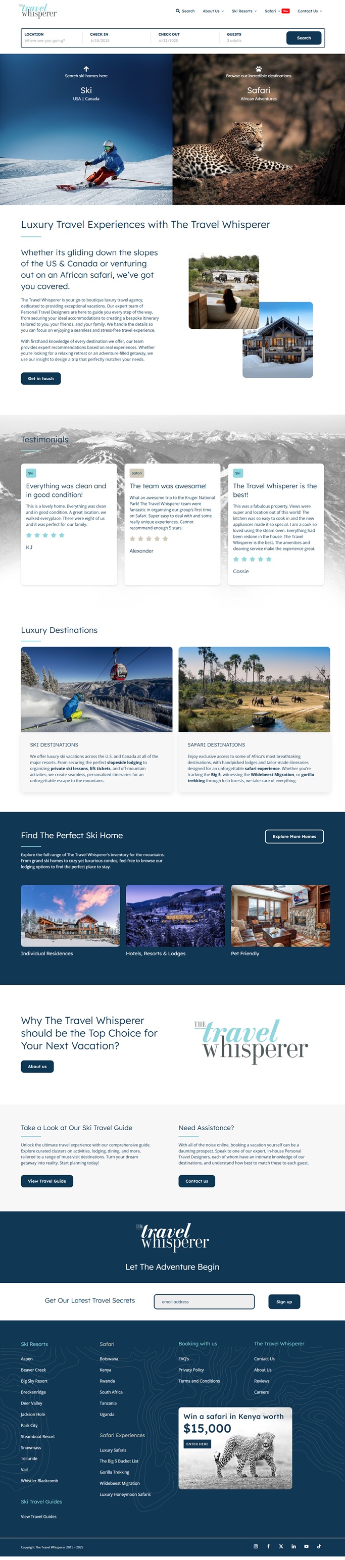 The Travel Whisperer is a full service, luxury travel agency focusing on the best ski vacations in North America, incredible safari trips across Africa and indulgent beach destinations throughout the Caribbean and Indian ocean. Our team will ensure we match your needs with the perfect itinerary from start to finish, including all the finer elements!